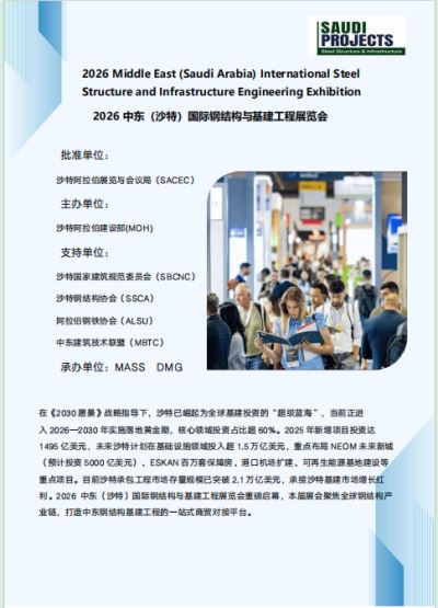 承接沙特基建市场增长红 利。2026 中东(沙特)国际钢结构与基建工程展览会重磅启幕,本届展会聚焦全球钢结构产 业链,打造中东钢结构基建工程的一站式商贸对接平台。